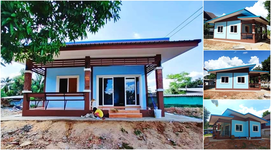 สวัสดีคุณผู้อ่านที่น่ารักทุกท่าน และผู้มีแผนจะสร้างบ้าน กำลังมองหาแบบบ้านหรือไอเดียสำหรับสร้างบ้านกันอยู่ กลับมาพบกับเราเว็บไซต์ thailetgo.com เรามีบ้านสวยงบน้อย ไอเดียสร้างบ้านงบประหยัดมาให้ชมกันประจำทุกวัน สำหรับบบ้านที่นำมาฝากวันนี้ลักษณะออกแบบเป็นบ้านชั้นเดียวสไตล์โมเดิร์นขนาดกะทัดรัด หลังคาแบบเพิงแหงนเรียบง่ายตามแบบกำลังนิยมกันอย่างแพร่หลาย ผนังภายนอกโทนสีฟ้าอ่อนตัดน้ำตาล หน้าบ้านมีรเบียงพักผ่อนมุงหลังคาด้วยเมทัลชีทพร้อมทำม้านั่งเล่นด้วย