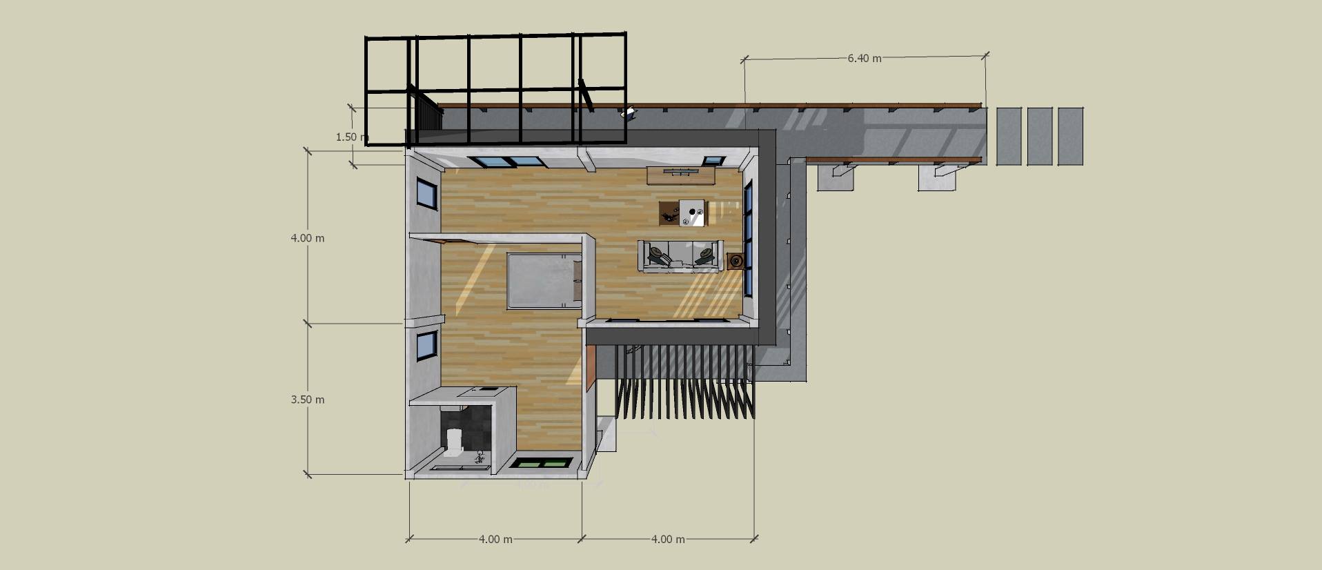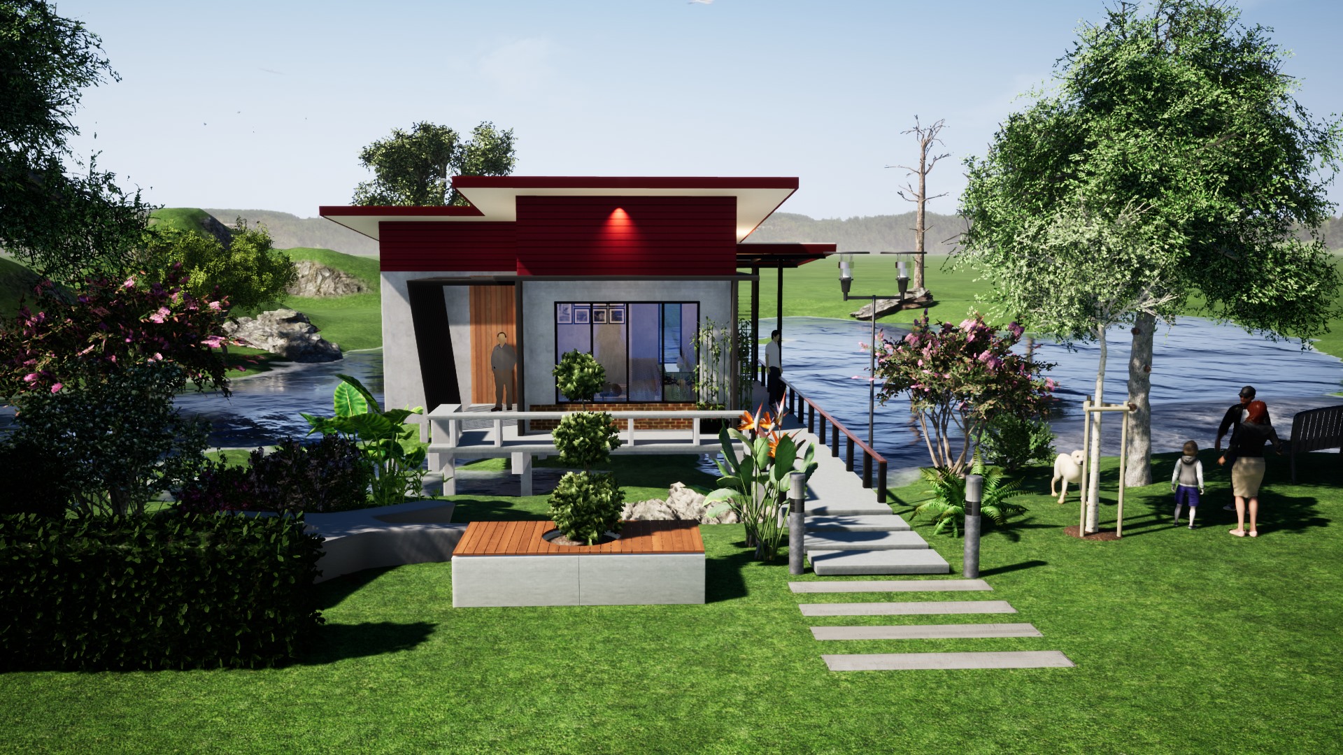 ลักษณะบ้านออกแบบเป็นบ้านพักอาศัยแบบชั้นเดียว แนวโมเดิร์นหลังคาแบบเพิงแหงนเรียบง่ายมุงด้วยเมทัลชีท ผนังแบบปูนเปลือยแนวลอฟท์ตัดกับระแนงใต้ชายคาสีน้ำตาล มีสะพานคอนกรีตเชื่อมไปยังตัวบ้านพร้อมทำราวกั้นตาก หน้าบ้านและด้านข้างมีระเบียงพักผ่อนรับลมชมวิวธรรมชาติ ฟังก์ชั้นภายในประกอบด้วย 1 ห้องนอน 1 ห้องน้ำ 1 ห้องโถง
