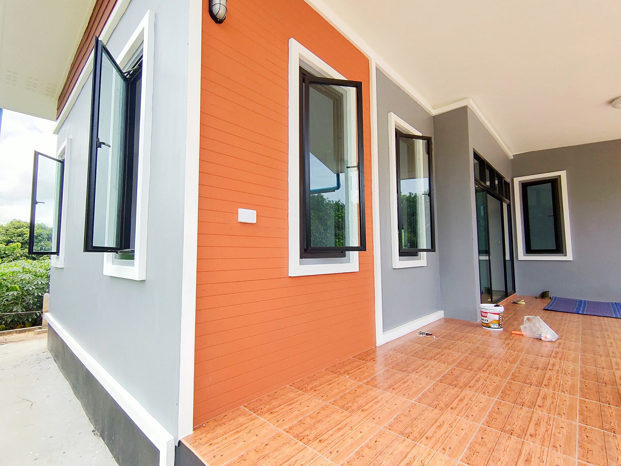 ลักษณะบ้านออกแบบเป็นบ้านพักอาศัยแบบชั้นเดียวแนวโมเดิร์นรูปทรงตัวแอล หลังคาแบบเรียบแบนลาดเอียงซ้อนเล่นระดับสวยงามเข้ากับรูปทรงตัวบ้าน ตัวบ้านยกระดับพื้นสูงขึ้นประมาณ 1 เมตร ผนังภายนอกโทนสีเทาตัดส้มเสริมความสวยเด่นมีมิติ ประตูหน้าต่างใช้แบบกระจกทั้งหลังช่วยให้ความสว่างภายในบ้าน หน้าบ้านมีระเบียงปูพื้นด้วยกระเบื้องและมุงหลังคาด้วยเมทัลชีท