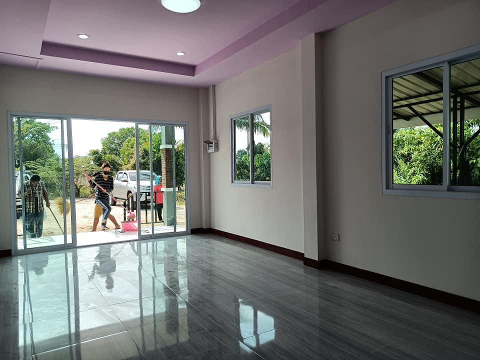 ส่วนของภายในบ้านห้องโถงกลางรับแขกโล่วกว้างปูพื้นด้วยกระบื้องลายไม้สีน้ำตาลอ่อนผนังห้องโทนสีเหลืองอ่อนและฝ้าเพดานแบบหลุ่มทรงเหลียมสีชมพูสวยหวานเชื่อมต่อกับห้องครัวทำประตูกระจกแบบเลื่อนครัวเป็นแบบเคาน์เตอร์ซิงค์ปูนรูปทรงตัวแอลติดด้วยงานกระเบื้องโทนสีดำด้านล่างทำเป็นประตูเปิดเก็บของด้วยพื้นห้องปูด้วยกระเบื้องและมีประตูออกหลังบ้านโซนซักล้างได้ ภายในประกอบด้วย 2 ห้องนอน 1 ห้องน้ำ 1 ห้องครัว และห้องโถงกลางรับแขก พร้อมด้วยระเบียงและโรงจอดรถ พื้นที่ใช้สอย 75 ตารางเมตรไม่รวมโรงจอดรถ พิกัด อ.กันทรารมย์ จ.ศรีสะเกษ