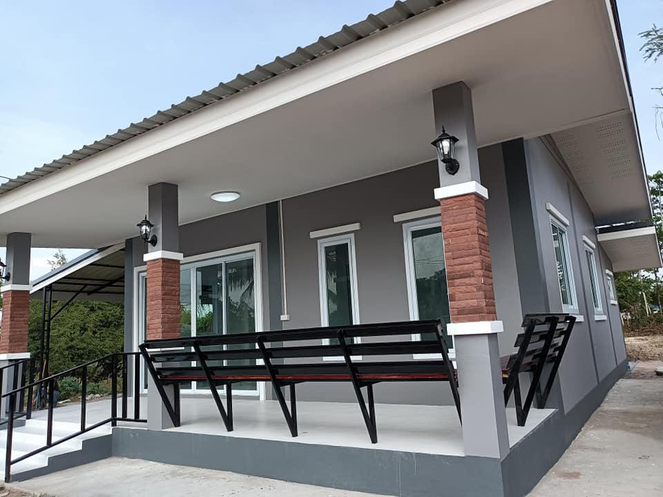 ลักษณะบ้านหลังนี้ออกแบบเป็นบ้านพักอาศัยแบบชั้นเดียวแนวโมเดิร์นเรียบง่ายหหลังคาแบบเพิงแหงนลาดเอียงมุงหลังคาด้วยเมทัลชีทฝ้าชายคาเรียบสีขาวผนังชายคาสีเทาเข้าแซมด้วยสีแดงเล็กน้อย ตัวบ้านยกระดับพื้นสูงขั้นเล็กน้อยพอสวยงามผนังด้านนอกแบบปูนฉาบเรียบโทนสีเทาตัดกับเสาและฐานสีเทาเข้มและสีขาวของคิ้วบัวประตูหน้าต่างแบบกระจกทรงสูงให้ความทันสมัย หน้าบ้านมีระเบียงมุงหลังคาปูพื้นด้วยกระเบื้องพร้อมทำเป็นม้านั่งเล่นด้านข้งมุงหลังโรงจอดรถและเทด้วยคอนกรีต
