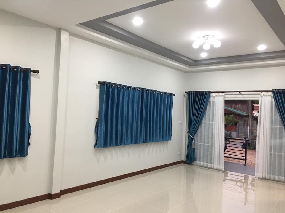 ส่วนของภายในบ้านห้องโถ่งกลางรับแขกขนาดใหญ่กว้างขวางปูพื้นด้วยกระเบื้องสีครีมผนังและฝ้าเพดานสีขาวแบบหลุ่มทรงเหลี่ยมติดด้วยโคมไฟประดับ ห้องน้ำตกแต่งด้วยงานกระเบื้องแบบเต็มฟังก์ชั้นภายในบ้านหลังนี้ประกอบด้วย 2 ห้องนอน 1 ห้องน้ำ ห้องโถง พื้นที่ใช้สอย 58.50 ตร.ม. งบประมาณ 450,000 บาท พิกัด ต.สระบัว อ.ปทุมรัตต์ จ. ร้อยเอ็ด