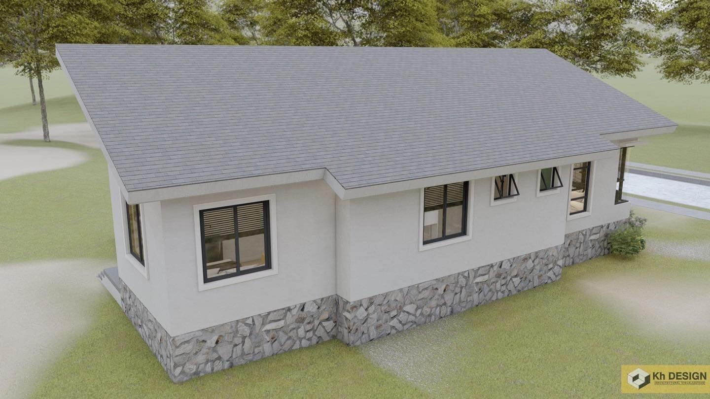 ลักษณะออกแบบบ้านหลังนี้เป็นบ้านพักอาศัยชั้นเดียวสไตล์โมเดิร์นหลังคาแบบทรงแหงนลาดเอียงซ้อนเล่นระดับคล้ายปีกนก ฐานตัวบ้านยกระดับพื้นสุงขึ้นประมาณ 1 เมตร ผนังภายนอกปูนฉาบเรียบตกแต่งด้วยงานหินสังเคระาห์และระแนง ใช้ประตูและหน้าต่างแบบกระจกเสิรมความทันสมัย หน้าบ้านมีระเบียงมุงหลังคาและด้านข้างตัวบ้านพร้อมทำราวกั้นตกและระเบียงเชื่อมต่อถึงประตูทางออกหลังบ้านโซนซักล้าง