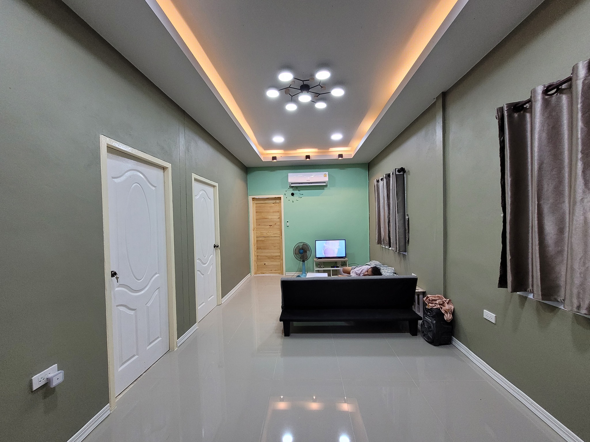 ส่วนของภายในบ้านห้องโถงกลางรัยแขกโล่งกวางปูพื้นด้วยกระเบื้องสีครีมแผ่นใหญ่ 60×60 เซนติเมตร ผนังโทนสีเขียวพาสเทลและฝ้าเพดานแบบหลุ่มทรงเหลี่ยมพร้อมติดไฟดาวน์ไลท์และโคมไฟประดับกลางห้อง ห้องครัวขนาดใหญ่แบบเคาน์เตอร์ซิงค์ปูนติดงานกระเบื้องสีดำผนังห้องปูด้วยกระเบื้องบ้างส่วน ฟังก์ชั้นาภยในประกอบด้วย 2 ห้องนอน 1 ห้องน้ำ 1 ห้องครัว และห้องโถงกลางรับแขก พร้อมด้วยระเบียงหน้าบ้าน งบประมาณก่อสร้าง 780,000 บาท