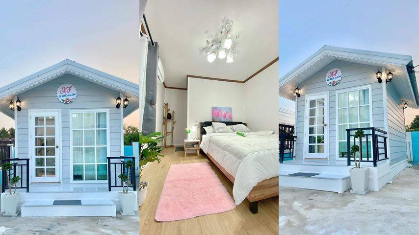 ลักษณะบ้านเป็นบ้านขนาดเล็กกะทัดรัดน่ารัก หลังคาแบบทรงจั่วเรียบง่าย หน้าบ้านมีระเบียงขนาดเล็กไว้นั่งเล่นรับลมชมวิว ใช้ประตูและหน้าต่างแบบกระจกแบบช่องลูกฟัก ภายในเป็นสวนของห้องโถงและห้องนอน ฝ้าเพดานแบบเรียบติดโคมไฟประดับ และมีห้องน้ำภายในตัว ตกแต่งด้วยงานกระเบื้องแบบเต็มผนัง ใครกำลังมองหาไอเดียสร้างบ้านพักหลักเล็ก บ้านสวน หรือบ้านพักรีสอร์ทก็ดี ชมเป็นไอเดียกันได้เลยครับ