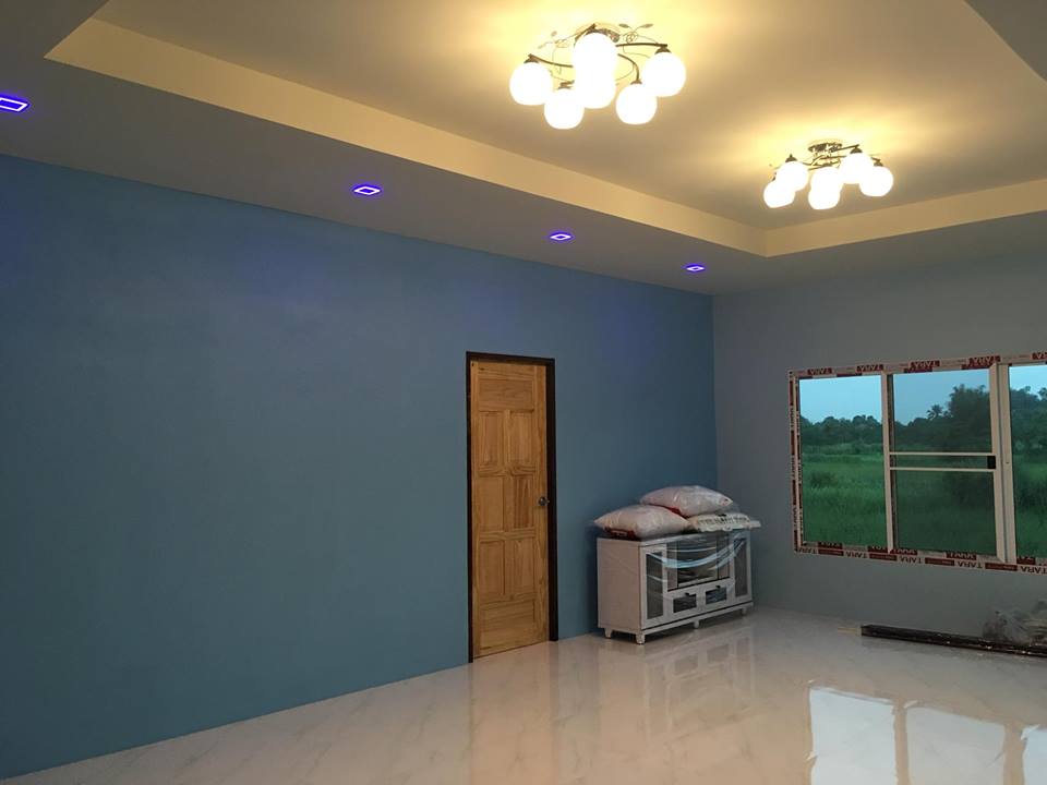 แบบบ้านชั้นเดียวสไตล์โมเดิร์น ลักษณะบ้านออกแบบหลังคาทรงแหงน ตัวบ้านยกพื้นสูงประมาณ 50 ซม เสาหล่อ อิฐบล็อก หลังคาเมทัลชีท ฝ้า SCG ติดฉนวน ไฟ LED ทั้งหลัง ทาด้วยโทนสีฟ้าสดใส ฟังก์ชั้นภายในประกอบด้วย 3 ห้องนอน 1 ห้องแต่งตัว 1 ห้องน้ำ 1ครัวเล็กๆ พื้นที่ใช้สร้อย 121 ตร.ม. งบก่อสร้าง 9 แสนกว่าๆ ไม่รวมถมที่ (ค่าช่าง3.5แสน ซื้อวัสดุเอง) ขอบคุณข้อมูลแลภาพเจ้าของบ้านคุณ Jaewwaew Niramon ติตตามชมกันเลย!