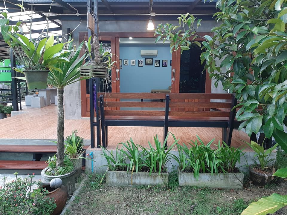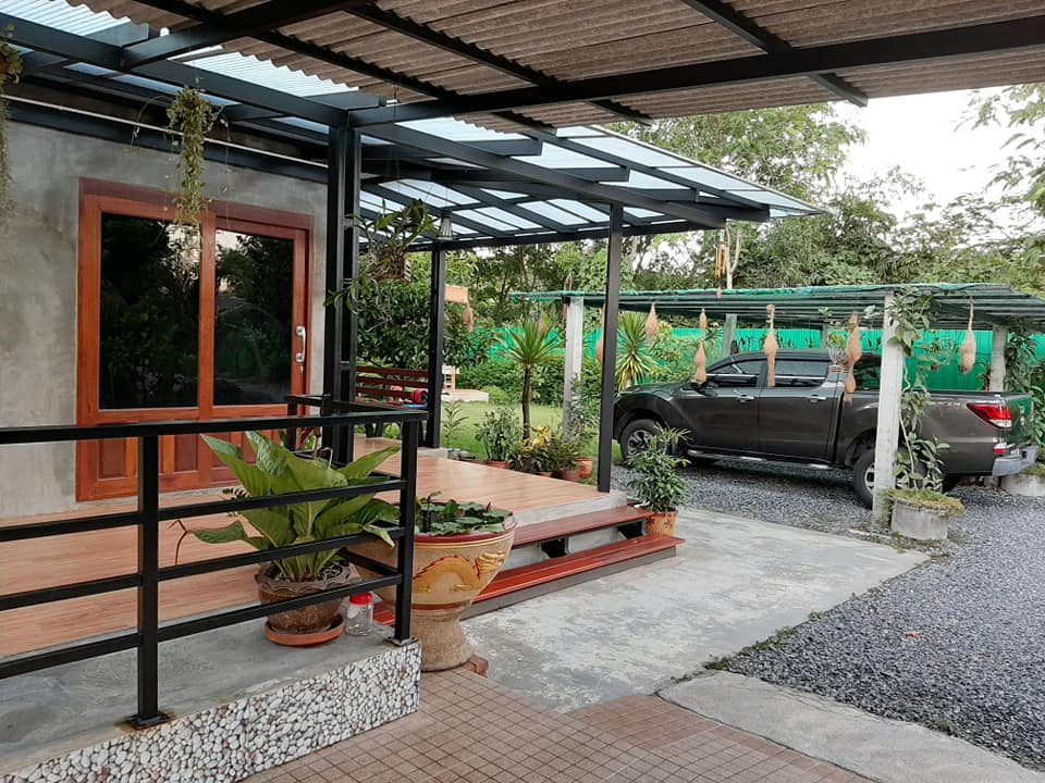หน้าบ้านมีระเบียงพักผ่อนรอบๆ ตัวบ้านทำเป็นม้านั่งพื้นปูนด้วยกระเบื้องลายไม้เข้ากับปูนเปือยแนวลอฟท์อย่างดี และพร้อมจัดมุมนั่งเล่นมุมวางโต๊ะเก้าอี้ตอนรับแขกและเพื่อน เป็นมุมรับประทานอาหารนอกบ้านก็ได้ รอบตัวบ้านปลูกต้นไม้จัดสวนร่มรื่นน่าอยู่ ช่วยให้บ้านดูเย็นสบายเหมาะกับการพักผ่อนเลยทีเดียว